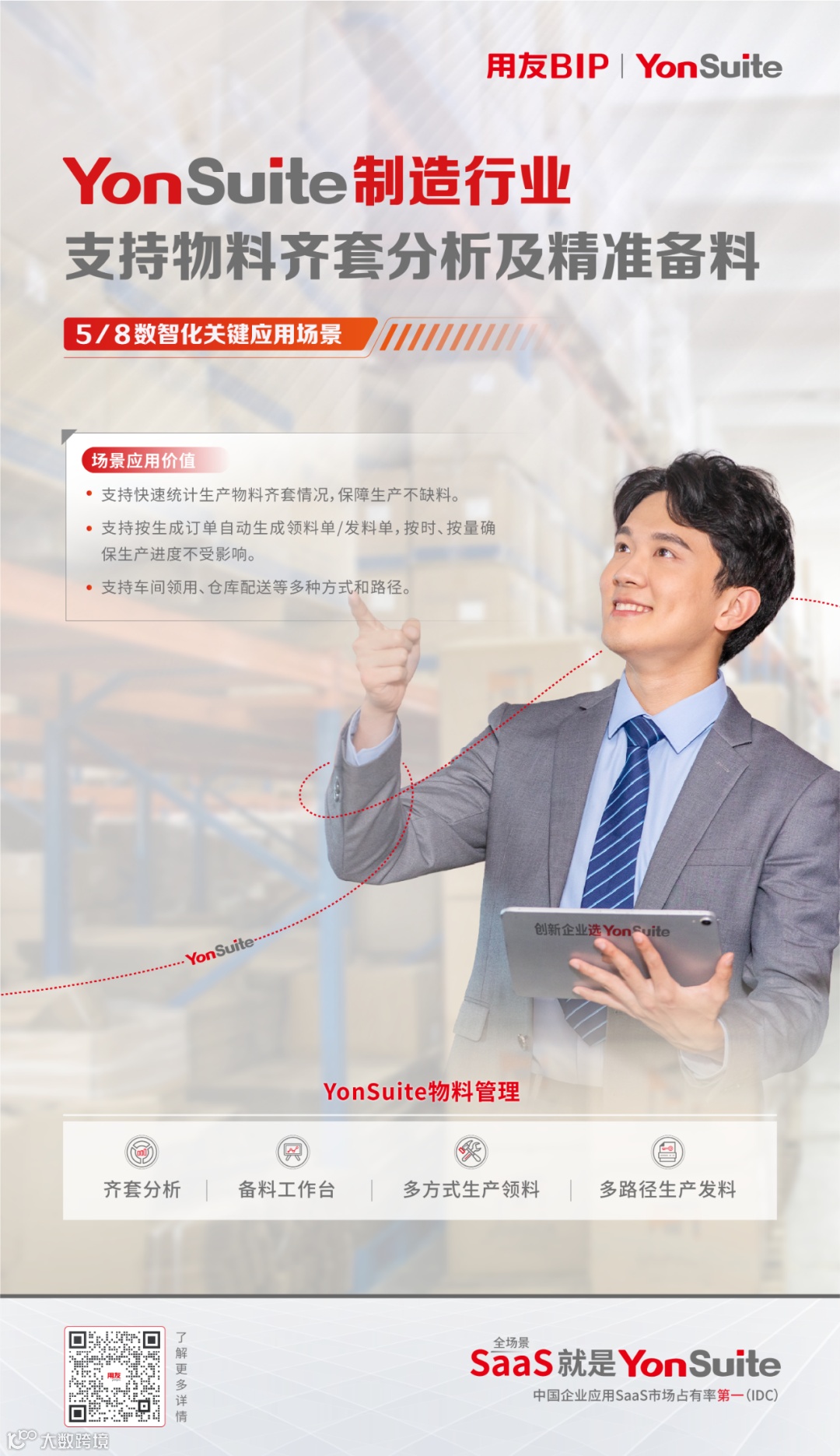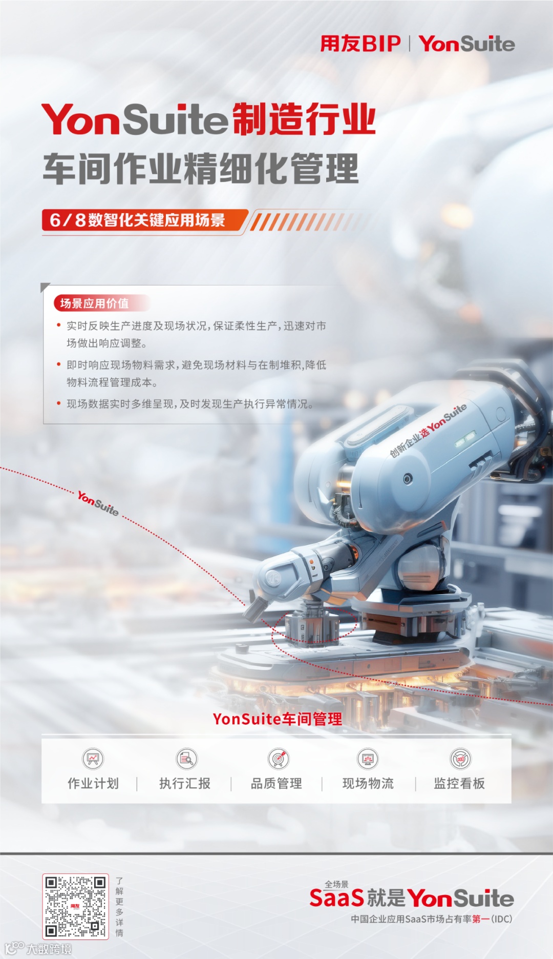 YonSuite制造行业生产工厂的八大关键应用场景,为企业提供了全方位的生产智造升级与工厂精细运营管理,强化了生产工厂计划管理、任务管理及车间作业管理,不仅实现了基于物流管理降本增效,更为企业未来的竞争力提升和商业价值创造奠定了坚实基础。展望未来,YonSuite将继续发挥其优势,助力制造企业打造新质生产力!