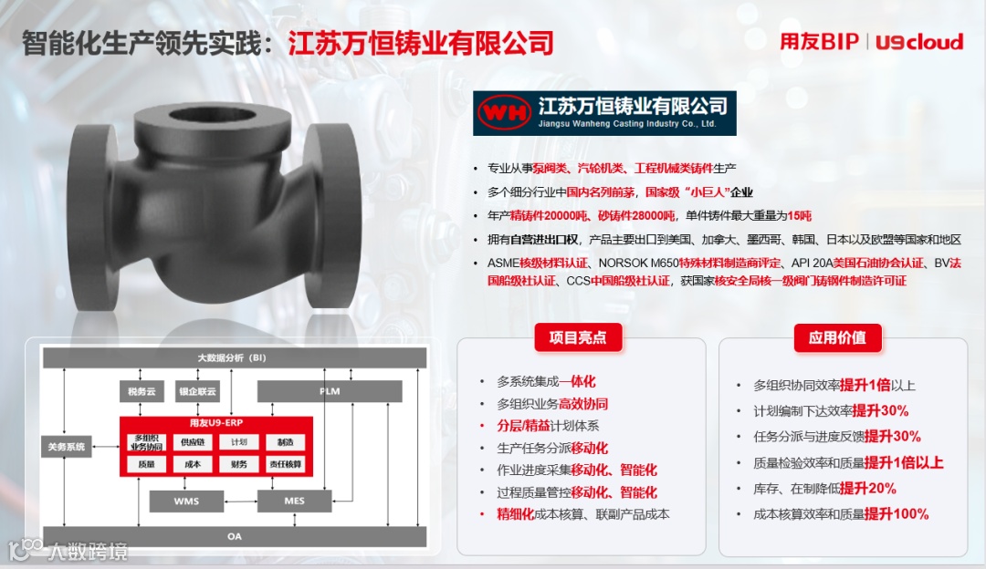例如江苏万恒铸业有限公司,通过引入U9 cloud智能制造套件,实现了分层及精益计划体系、生产任务分派移动化、作业进度采集移动化和智能化、过程质量管控移动化和智能化、精细化成本核算等目标。这些应用价值的实现不仅让企业在激烈的市场竞争中脱颖而出更成为了行业内的佼佼者。