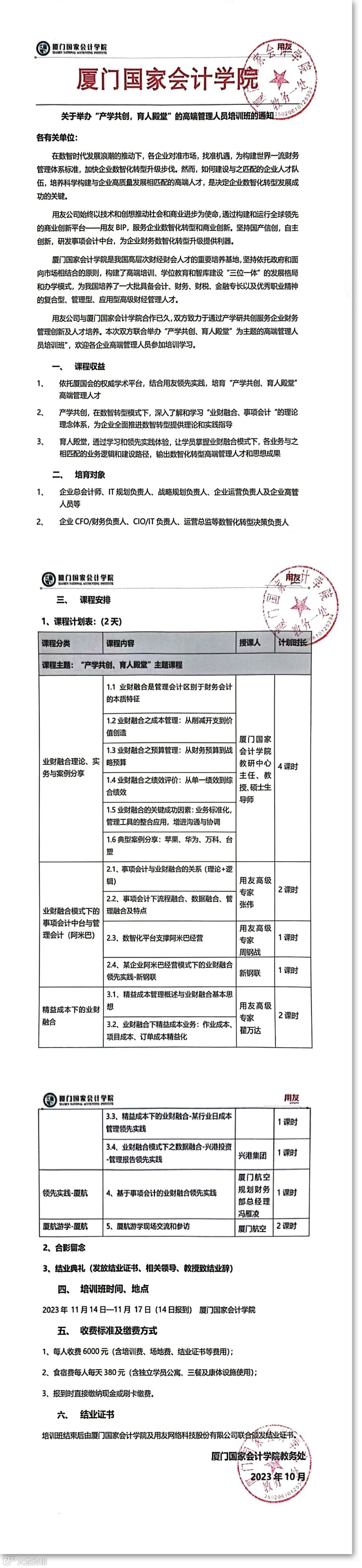 用友 x 厦门国家会计学院:“产学共创,育人殿堂”高端管理人员培训开始报名!