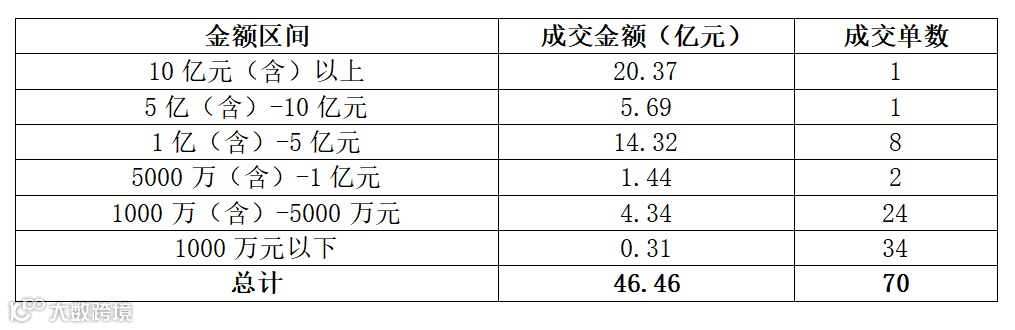 可以看出,交易金额在1亿元以上的交易对于交易规模的贡献率超过85%,而交易笔数仅占总成交笔数的不到四分之一。