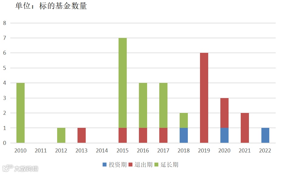 2024年成交标的基金处于投资期的有3只,处于退出期的有14只,处于延长期的有18只。按所涉标的基金成立年份及所处期限分布如下图: