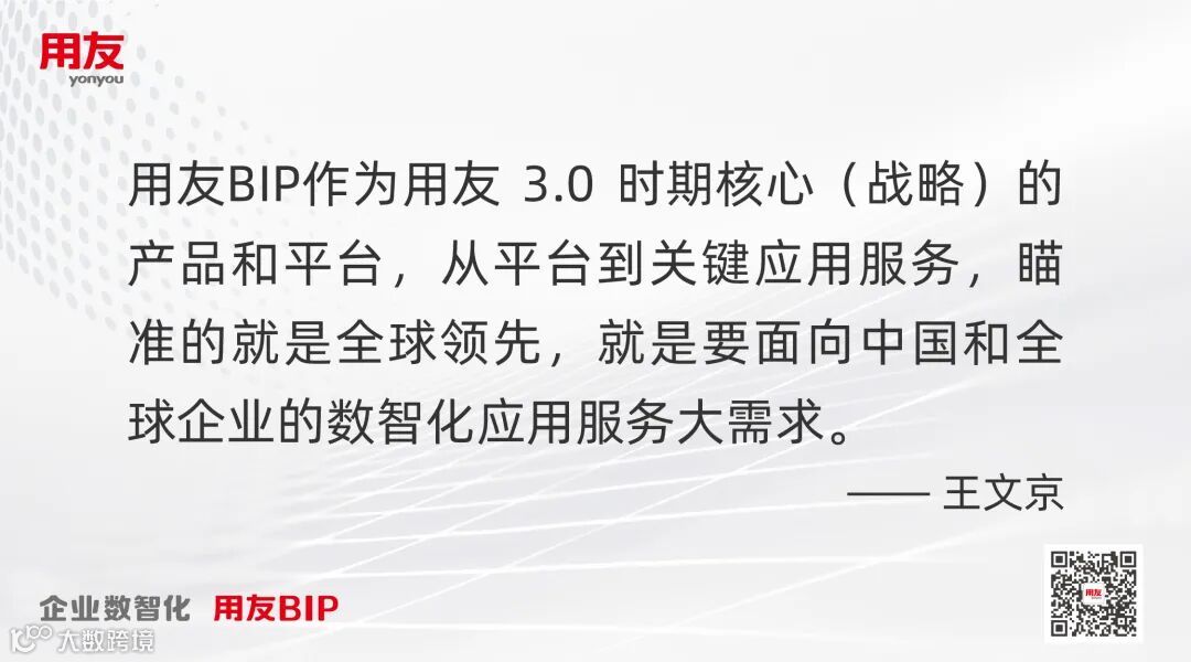 当前,用友为服务企业数智化而构建和运营的商业创新平台-用友BIP,可以说是用友持续创新、厚积薄发的一大成果,实现了从平台技术、应用架构到场景服务的全面突破,其中多项突破都属全球首创,处于全球领先水平。