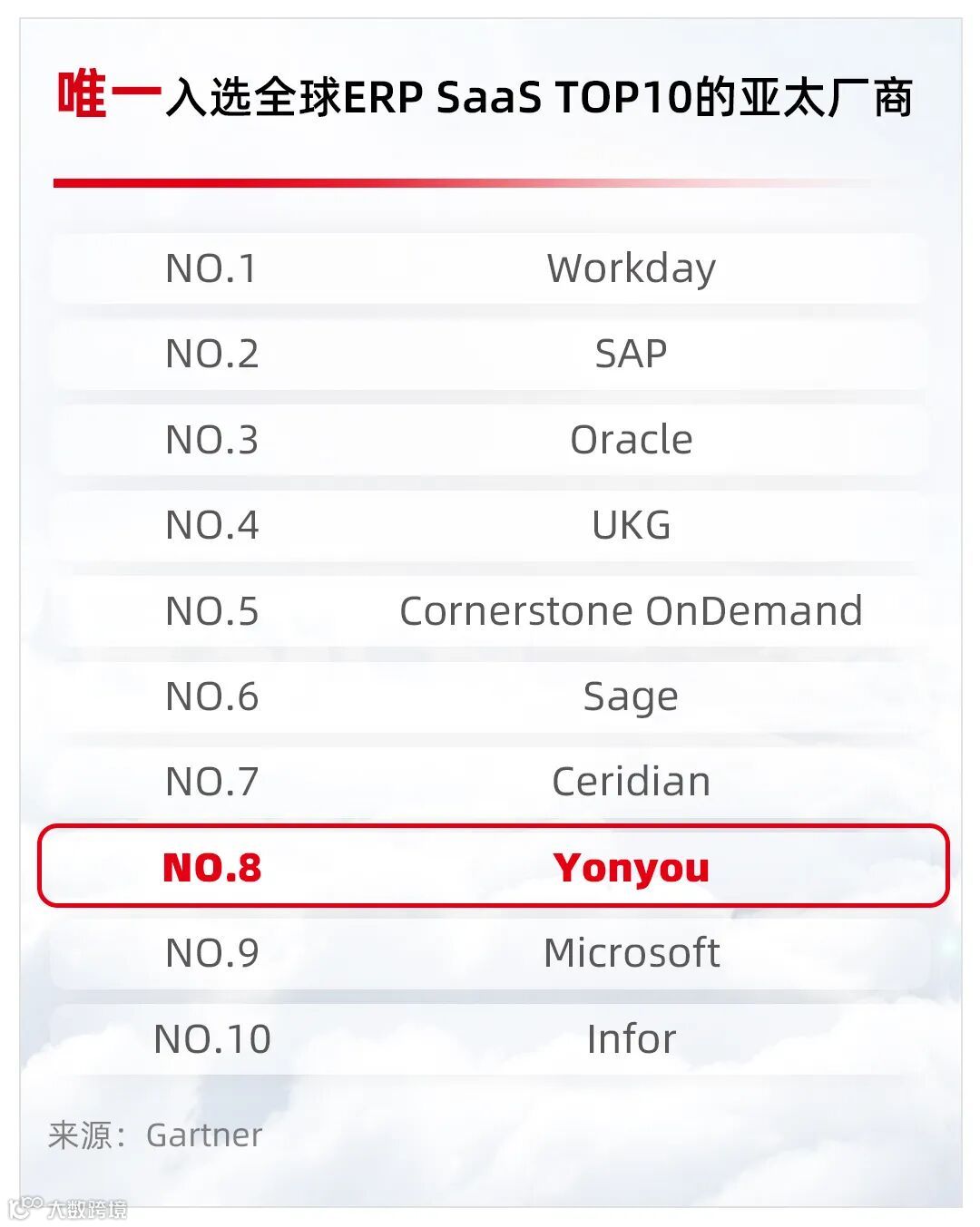 全球权威信息技术研究和顾问公司Gartner发布《Market Share: Enterprise Application Software as a Service, Worldwide, 2021》报告,用友在ERP SaaS市场位列全球第8位,是TOP10中唯一入选的亚太厂商!此外,用友在SCM SaaS市场位列全球第13位,是TOP15中唯一入选的亚洲厂商!