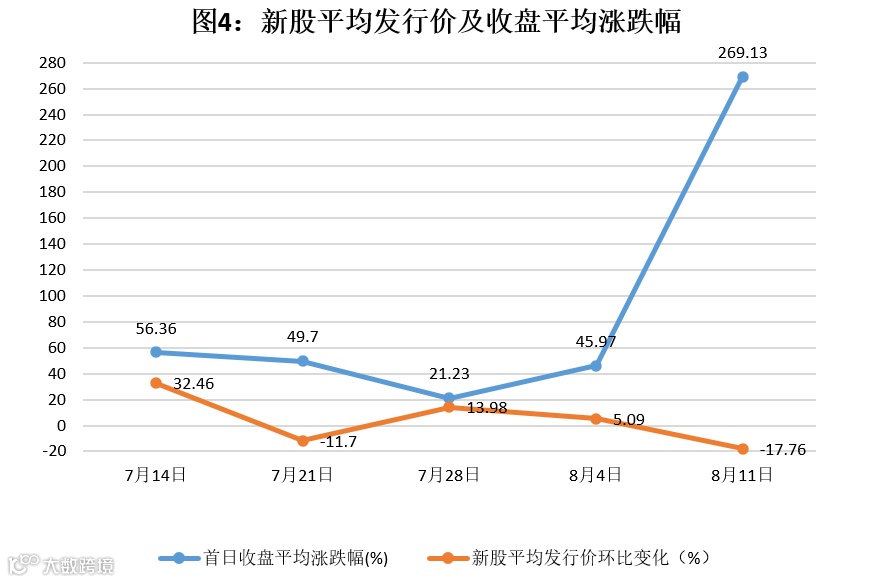 本周新股平均发行价为33.61元,较上周下降了17.76%,低于2023年8月平均水平(36.21元)。本周新股首日平均涨幅为269.13%,环比上升223.16%。