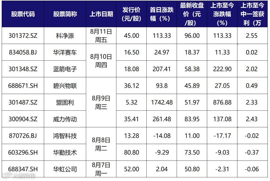 本周9只上市新股中创业板居多,共有4只创业板新股,分别为科净源(301372.SZ)、蓝箭电子(301348.SZ)、盟固利(301487.SZ)、威力传动(300904.SZ),募集资金约26.25亿元;科创板新股2只,分别为碧兴物联(688671.SH)、华虹公司(688347.SH),募集资金约219.12亿元;北交所新股2只,分别为华洋赛车(834058.BJ)、鸿智科技(870726.BJ),募集资金约3.7亿元;沪市主板新股1只,为华勤技术(603296.SH),募集资金约58.52亿元。