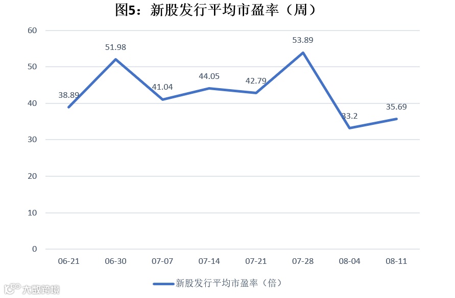 发行市盈率方面,本周上市新股平均市盈率为35.69倍,环比上升7.5%。