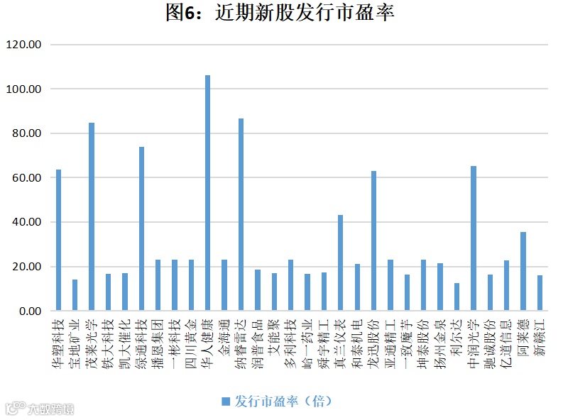 我们观察近期上市的30只上市新股发行市盈率,共9只新股发行市盈率高于50倍,均来自创业板和科创板。其中华人健康(301408.SZ)在近30只上市新股中发行市盈率最高,为106.19倍。本周上市新股中茂莱光学(688502.SH)发行市盈率最高,为84.8倍。