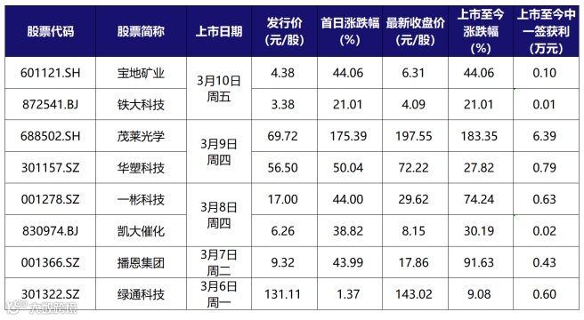 本周(3月6日—3月10日)上市新股表现优异,上市8只新股均获得正收益。其中科创板新股茂莱光学(688502.SH)上市至周五大涨183.35.%,中一签最高可盈利6.39万元,公司作为精密光学综合解决方案提供商,专注于精密光学器件、光学镜头和光学系统的研发、设计、制造及销售。凭借垂直整合能力,为客户提供“光、机、电、算”一体化的解决方案。
