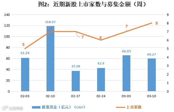 本周共8只新股上市,募集资金60.27亿元,较上周减少了5.76亿元。
