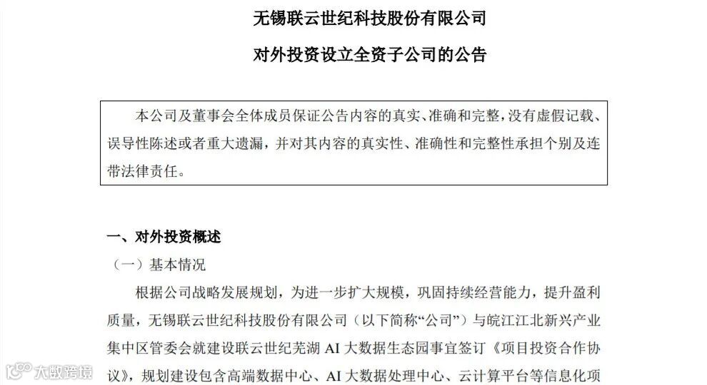 近日,联云世纪发布公告,拟投资1亿元成立全资子公司,以承接芜湖AI大数据生态园建设项目。