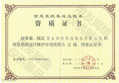 用友网络科技股份有限公司(以下称“用友网络”)于9月15日获得中国电子信息行业联合会(以下称“电子联合会”)颁布的《信息系统集成及服务资质运行维护分项资质》(壹级),成为15家首批获得壹级资质的企业。