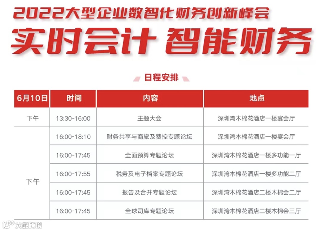 2022大型企业数智化财务创新峰会主题大会将于2022年6月10日 13:30在深圳湾木棉花酒店一楼宴会厅准时开始,16:00五大专题论坛将同步开展,主题大会与专题论坛【全程直播】,会议日程安排如下: