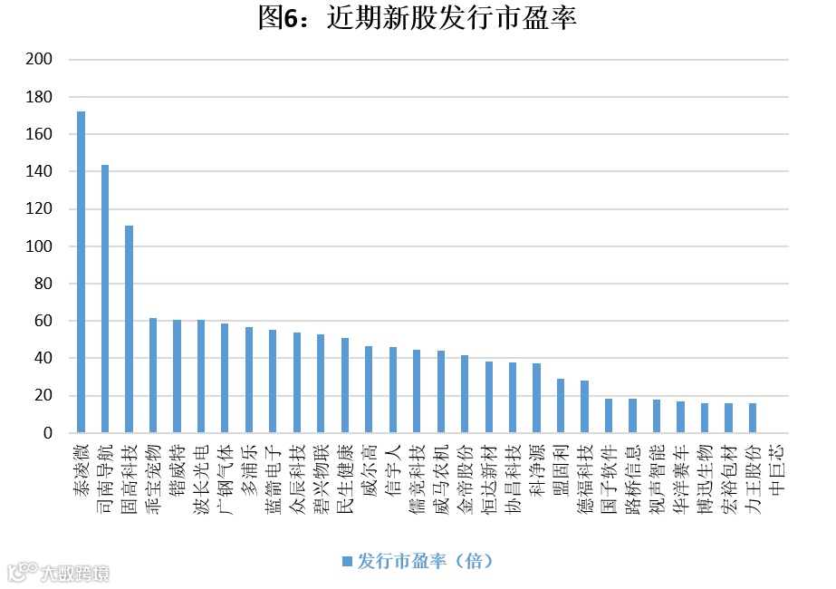 我们观察近期上市的30只新股发行市盈率,科创板新股发行市盈率明显高于其他板块。首发市盈率最高的为泰凌微(688591.SH),达到172.25倍。