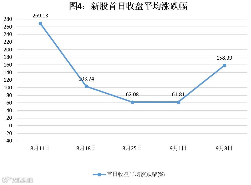 我们梳理了8月所有上市的新股,共有33只(包括京沪深交易所),其中破发的有2只,占比6%,平均跌幅为11.68%。有9只新股首日涨幅破百,涨幅在50%-100%之间的有8只,涨幅在0-50%之间的有14只,总体而言,31只上涨新股的算数平均涨幅为138.42%。