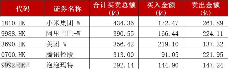 今年南下资金主要交易港股市场中新消费、人工智能等核心资产,从成交活跃个股来看,今年以来成交金额居前的5大个股是小米集团-W、阿里巴巴-W、美团-W、腾讯控股、泡泡玛特,详见下方表格。