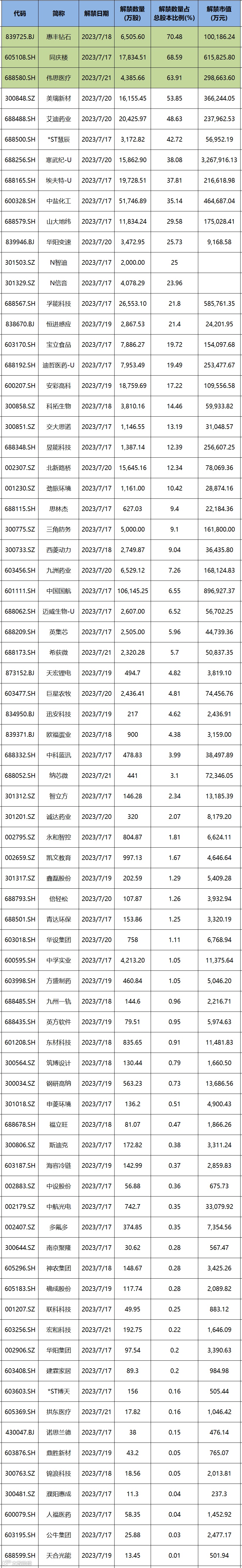 2023年07月17日-07月21日,共有75家上市公司解禁,解禁股数41.06亿股,解禁比例前三是惠丰钻石(70.48%)、同庆楼(60.59%)、伟思医疗(63.91%)。建议对于解禁规模占比较大的公司保持谨慎,密切关注解禁股可能产生的减持压力。