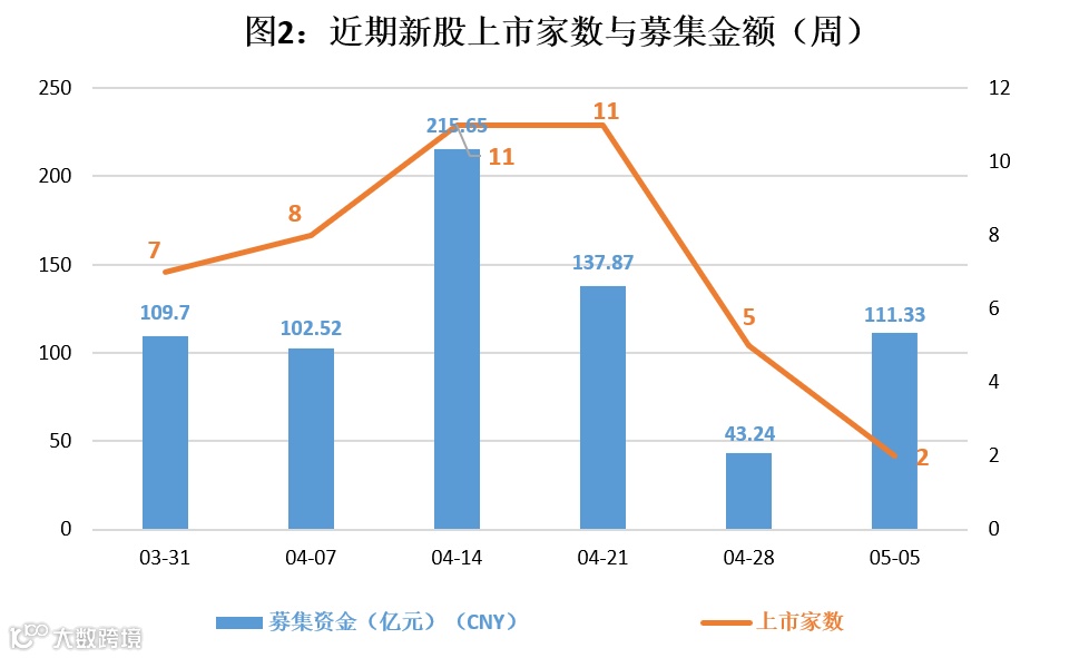 近两周新股平均发行价为29.3元,低于2023年4月平均水平(32.85元)。新股首日收盘平均涨跌幅(周)为22.72%,新股首日赚钱效应较之前略微回升。