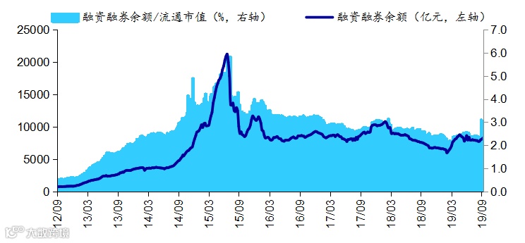 从融资融券资金来看,融资融券的规模也持续扩张,融资余额正逐步上升。截止9月10日,9月个股口径加总的股票融资余额为8337亿元,股票融券余额为96亿元,融资融券余额全市场流通市值占比为2.17%。