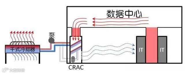 采用干式冷却器作为风冷冷水机旁通的节能冷却模式,当室外空气条件在设定值范围内时,利用干冷器直接冷却数据中心内的冷冻水。泵将冷冻水送入并穿过干式冷却器后的冷冻水送往机房精密空调。冷水机的旁通阀可根据室外冷风的冷冻程度决定关闭或在更高效率下运行。光大远期石景山机房就是采用的这种室外侧二级盘管的间接自然冷却系统。