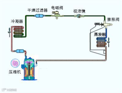 制冷剂在这四大部件内循环流动,根据制冷剂的压力变动、温度变化、气液转换,来完成热量的传递。液态制冷剂在蒸发器中吸收被冷却物质的热量之后,汽化成低压、低温的蒸汽,被压缩机吸入压缩成高压、高温的蒸汽,然后进入冷凝器向冷却物质放热而冷凝为高压、中温的液体,在经节流装置节流以后变为低压、低温的液态制冷剂,再次进入蒸发器吸热汽化,从而起到循环制冷的目的。