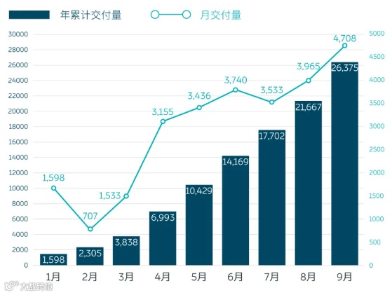 2020年9月,蔚来总计交付了4708台电动汽车,同比增长133.2%,创品牌单月交付量新高,自3月以来连续第7个月实现同比增长;蔚来三季度交付量达12206台,同比上涨154.3%,再创季度交付量新高;其中,蔚来ES8交付1482台,环比上涨31.7%,保持明显增长势头;蔚来ES6系列新成员EC6开启交付,ES6与EC6本月共计交付3226台,ES6单月交付量首次突破3000台;蔚来2020年累计交付26375台,今年前三季度交付量已超越去年全年。
