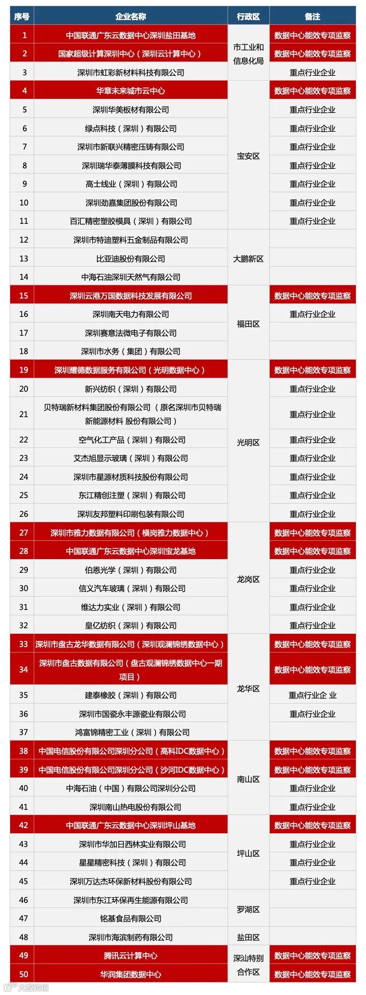 全市拟开展节能监察的企业数量共计50家,其中,包括电力、印刷、,玻璃、轮胎、陶瓷、塑料等重点行业企业共21家,重点用能单位15家,数据中心14家,其中由我局直接组织节能监察的企业3家,由各区工业和信息化主管部门负责组织节能监察的企业47家(节能监察企业名单可参考附件)。