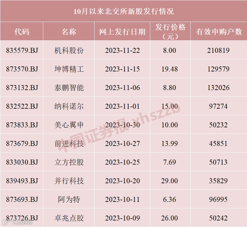 Wind数据显示,进入11月以来,北交所共有7只新股上市,上市首日均未破发。随着北交所新股的赚钱效应扩大,打新人数也出现激增。