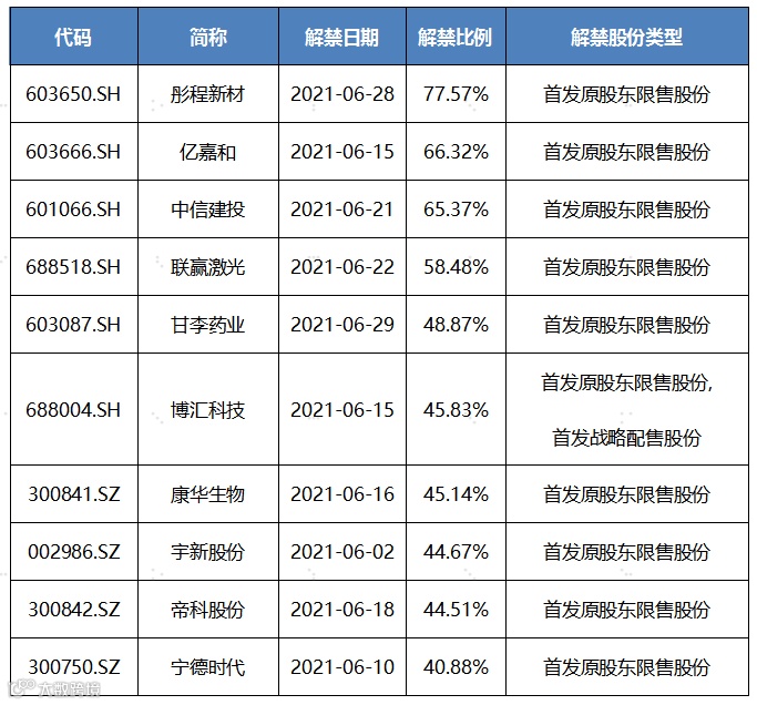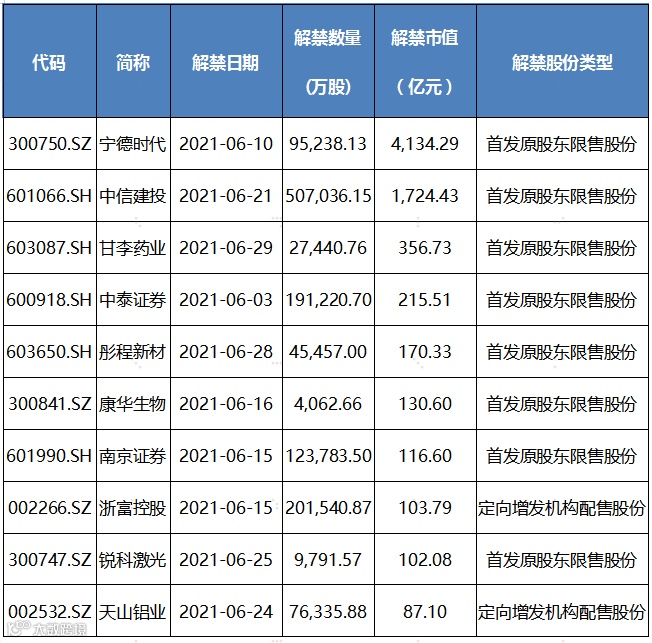 2021年6月解禁处于全年较高水平,解禁比例超50%个股数量有4只。再看具体个股,宁德时代、中信建投和甘李药业等个股的百亿级别解禁值得重点关注。