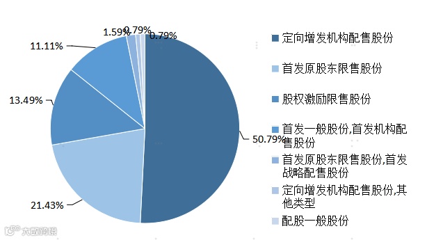 按解禁类型来看,6月解禁类型较为集中,定增解禁共有68家,占比45.03%,首发原股东限售股份解禁共有32家,占比21.19%;首发一般股份,首发机构配售股份解禁共有27家,占比17.88%;股权激励限售股份解禁共有16家,占比10.6%;首发原股东限售股份,首发战略配售股份解禁4家,占比2.65%;股权激励一般股份共有2家,占比1.3%;其他类型和首发原股东限售股份,追加承诺限售股份上市流通各有1家,分别占比0.66%。