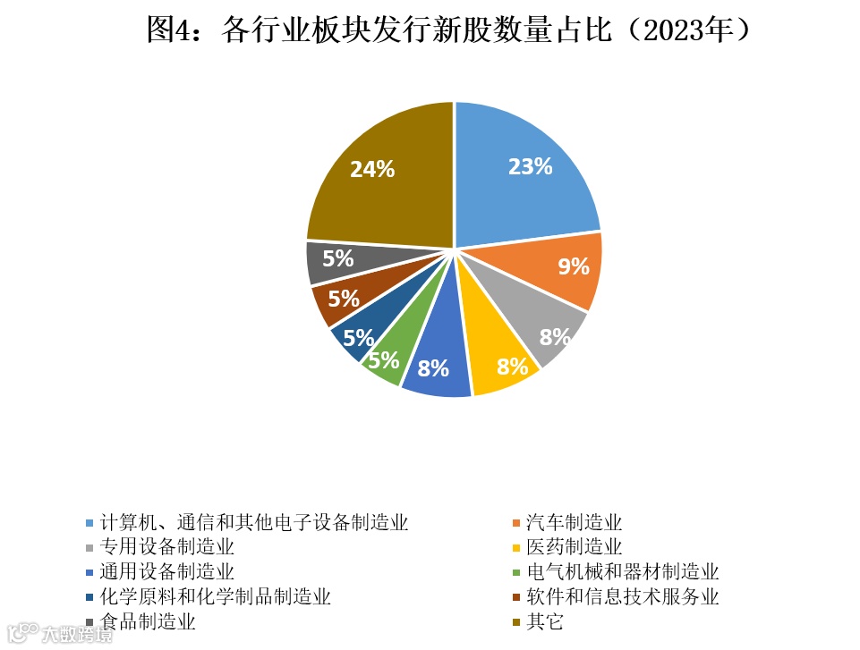 截至本周,2023年累计上市新股39只。从行业分布来看,计算机、通信和其他电子设备制造业公司数量最多,约占当年上市总数的23%。其次汽车制造业、通用设备制造业、医药制造业及专用设备制造业新股数量排名靠前。