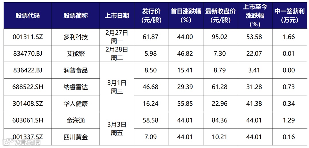 本周(2月27日—3月3日)共计有7只新股上市,新股行情表现优秀。