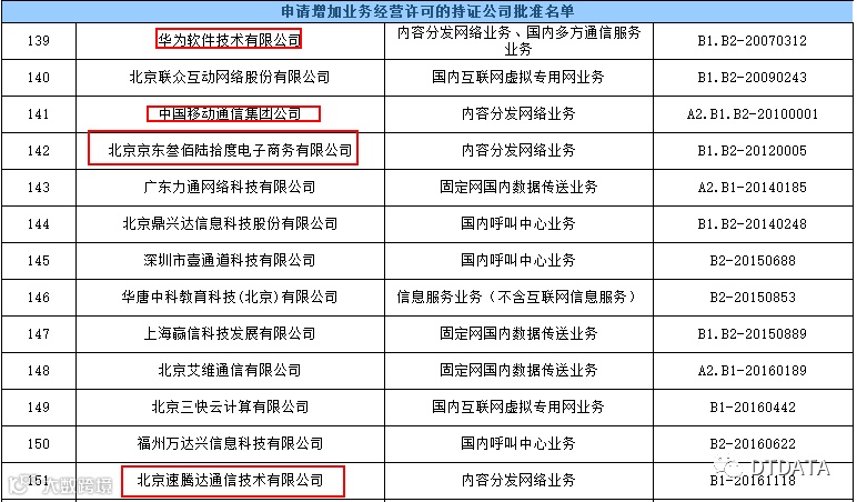 12月4日,获得CDN牌照企业分别为:华为软件技术有限公司、中国移动通信集团公司、北京京东叁佰陆拾度电子商务有限公司、北京速腾达通信技术有限公司、北京视界云天科技有限公司、青岛网信信息科技有限公司、广东网堤信息安全技术有限公司。