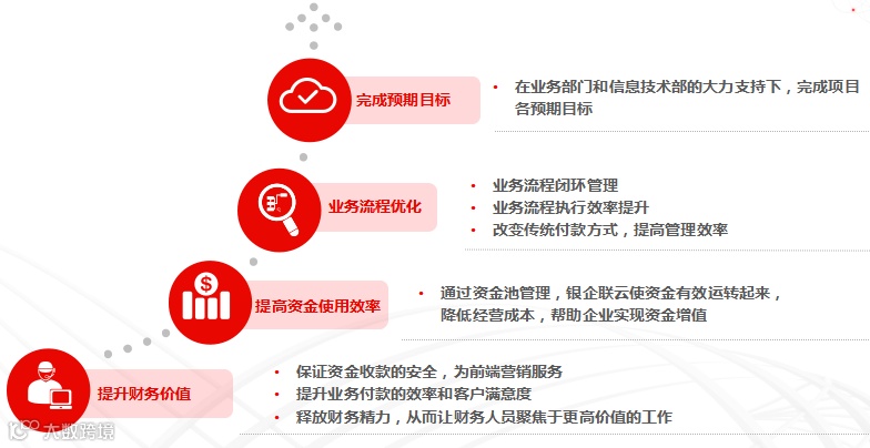 助力实时资金池服务,付款的排程计划控制,资金归集得到有效利用,创造更多的结构性存款的利息收入。