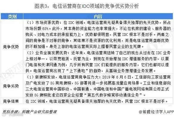 三、电信运营商具备得天独厚的先天优势 在IDC领域,电信运营商无疑具备得天独厚的先天优势,所占市场份额在50%以上。此外,其本身的资金能力也非常强大,不论在机房的建设、服务器的购买、对电力成本的承担能力上,优势都很明显,民营IDC根本不是对手。以下是电信运营商的优劣势分析: