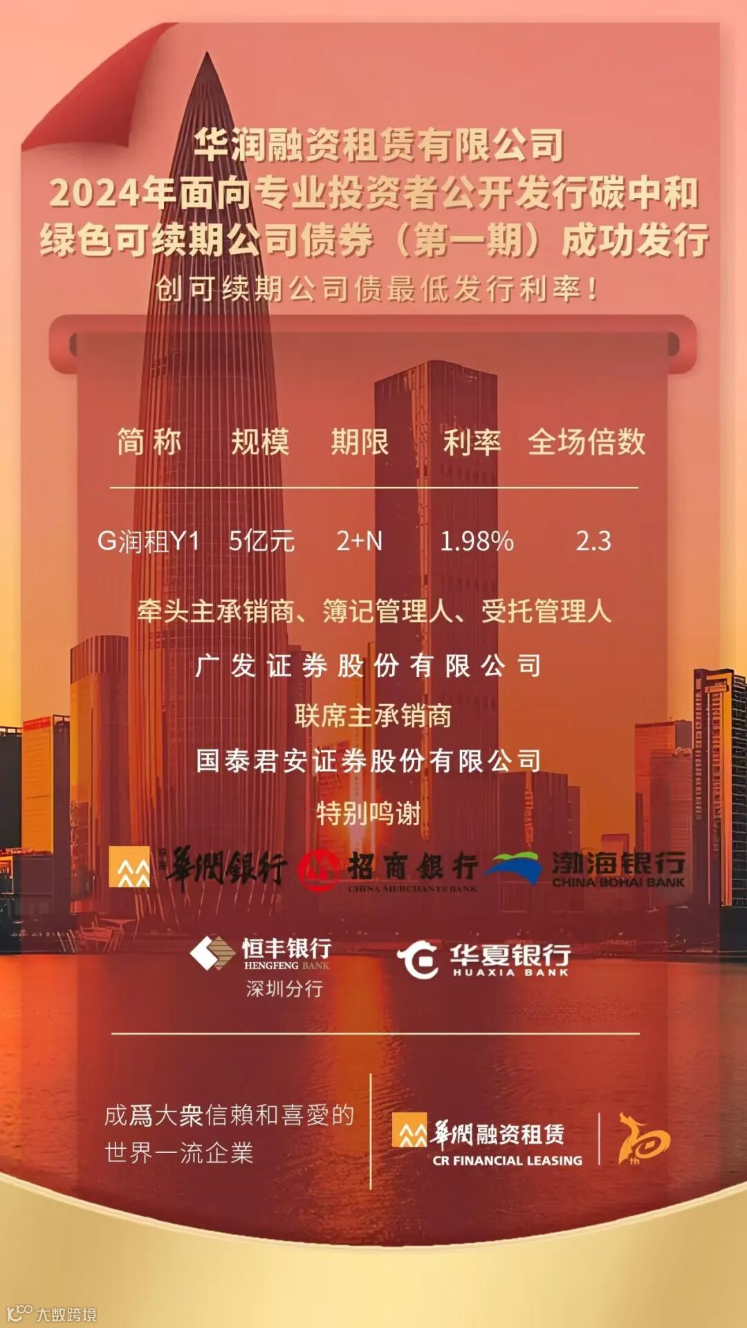 近日,由国泰君安主承销的华润融资租赁有限公司(简称”华润租赁”)2024年面向专业投资者公开发行的碳中和绿色可续期公司债(简称“G润租Y1”)在深圳证券交易所成功发行。本期债券发行规模5亿元,期限2+N年,票面利率1.98%,认购倍数2.3倍,充分彰显了投资者对可持续发展债券的坚定信心及对企业的充分认可。