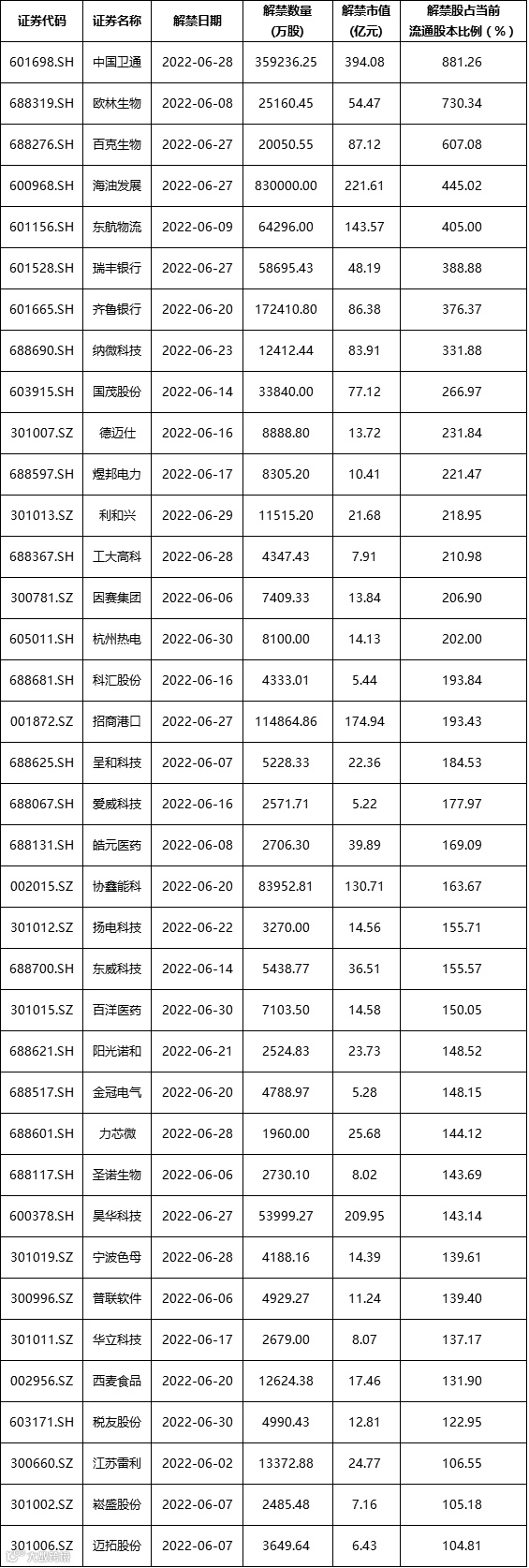 6月,A股市场共计213家上市公司将迎来解禁,解禁市值约3716亿元,环比提高42.9%,可能会对市场构成一些压力。其中,将有18家上市公司解禁规模超过50亿,最高解禁规模接近400亿元,投资者需特别关注。下表列举了解禁股份数量占流通股比例高于100%的公司。