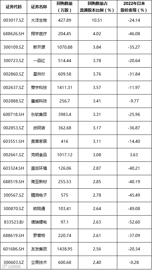 5月以来,虽然市场获得不小的反弹幅度,但估值依旧处于相对低位,因此上市公司股份回购的热情似乎并未减退。一般认为,股份回购是上市公司维护自身股价市值,向市场释放积极信号的行为。据统计,5月以来,共计211家上市公司实施回购,下表列示出回购数量占流通股份比例最高的前20家公司。