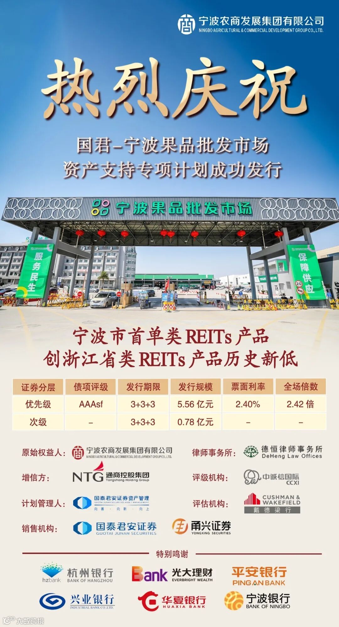 近日,宁波农商发展集团有限公司(简称“宁波农商集团”)在上海证券交易所成功发行“国君-宁波果品批发市场资产支持专项计划”。本期专项计划是宁波市首单类REITs产品,由国泰君安作为牵头销售机构,甬兴证券作为联席销售机构,上海国泰君安证券资产管理有限公司担任计划管理人。