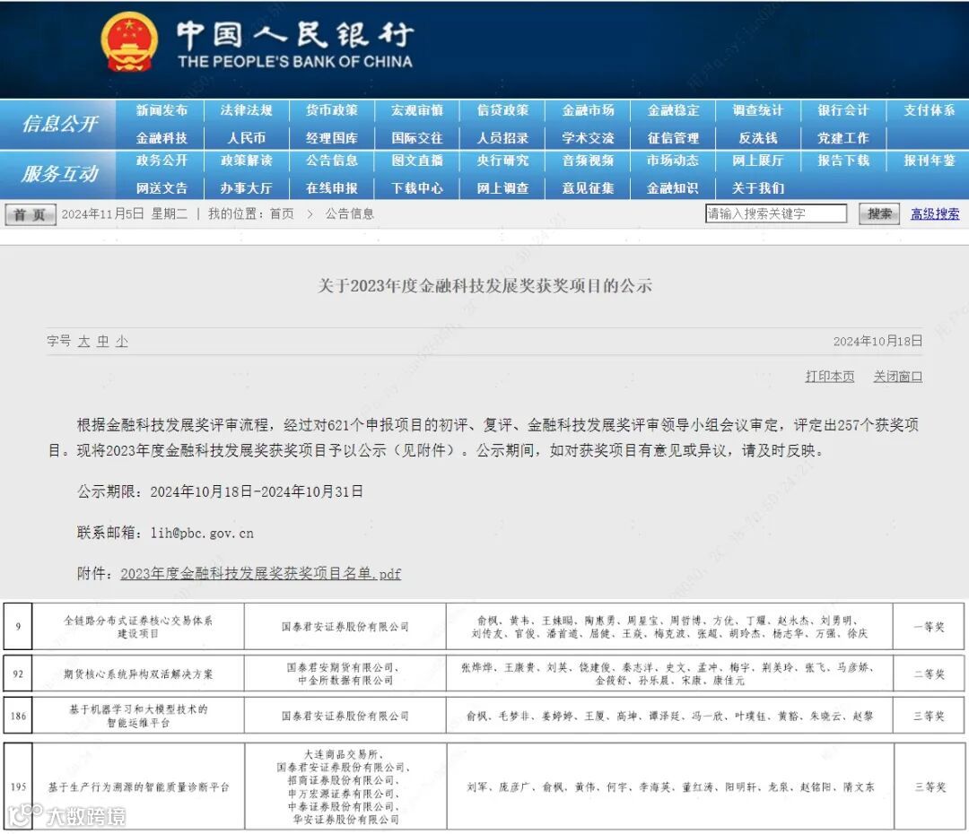 “金融科技发展奖”是中国金融业唯一的部级科技奖项,由中国人民银行于1992年设立,集中评选国内优秀金融科技创新成果,参与范围涵盖银行、证券、保险、支付等领域,极具权威性和影响力。国泰君安积极拥抱数智化浪潮,以金融科技驱动金融创新,已连续4年荣膺金融科技发展奖。