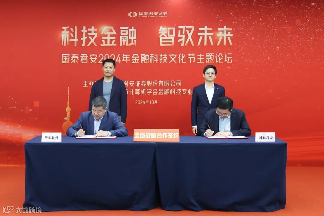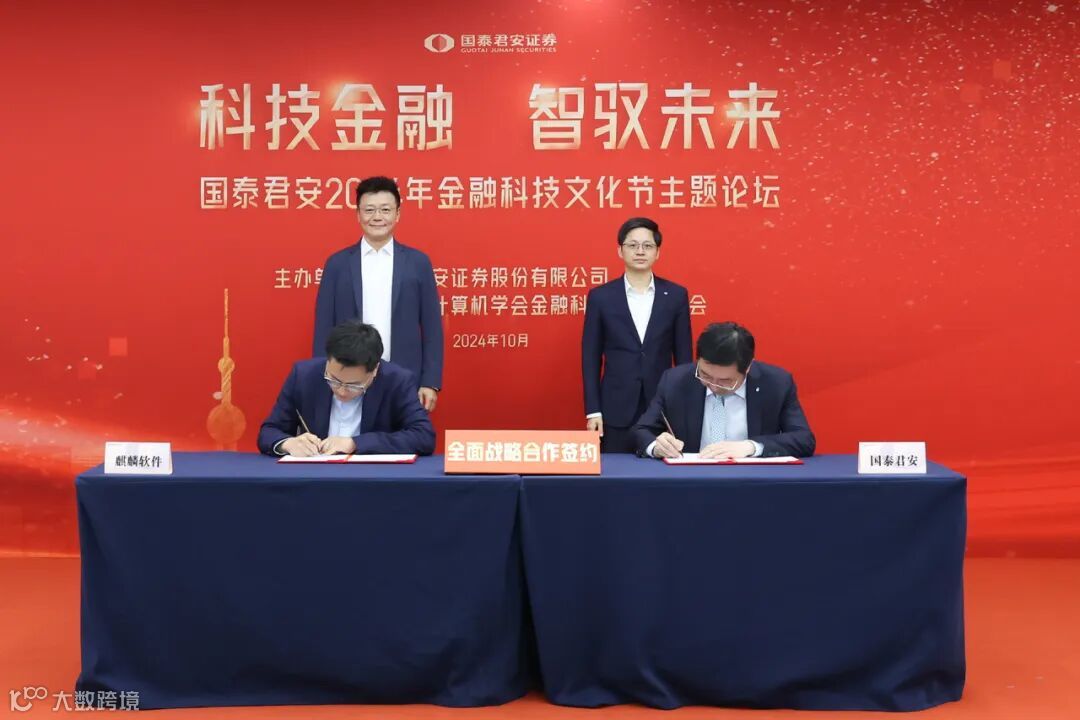 论坛现场,国泰君安战略客户部、信息技术条线和投行事业部,携手推动并举办了国泰君安与道客网络、格尔软件、凌志软件、绿盟科技、麒麟软件、天际友盟、天融信、信雅达、亚信安全、远地科技十家科技企业的全面战略合作签约仪式。未来,国泰君安将与优秀科技企业发挥各自优势,互利共赢,进一步推动联合创新,持续引领行业发展,探索“科技+金融”的新篇章。