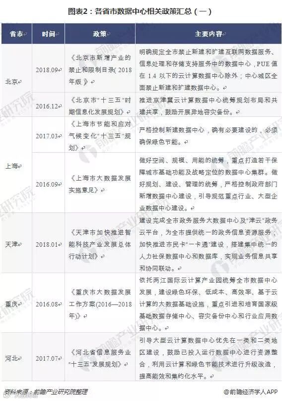 2018年9月26日,北京市政府公布《北京市新增产业的禁止和限制目录》(2018年版),其中对软件和信息技术服务业有了新规,要求全市层面禁止新建和扩建互联网数据服务、信息处理和存储支持服务中的数据中心(PUE值在1.4以下的云计算数据中心除外),中心城区全面禁止新建和扩建数据中心。