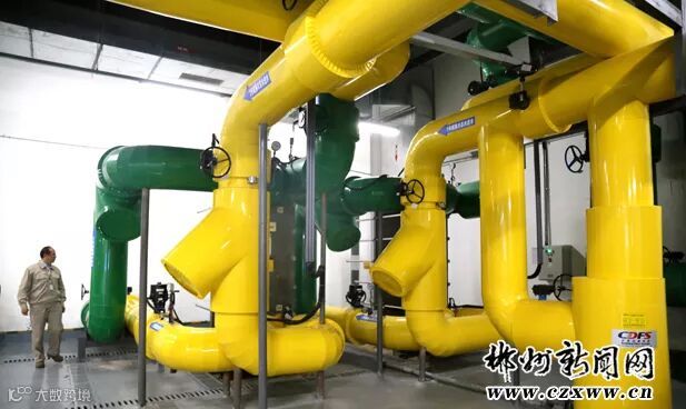 在东江湖数据中心一楼的冷冻站,记者看到黄色和绿色的通水管道交错分布。工作人员告诉记者,这是板式换热器,在机房吸收热量后温度稍高的冷冻水,与抽上来的低温湖水,在此进行热交换处理,冷冻水得以降温,再流向精密空调,转换为冷空气送往各个机房。