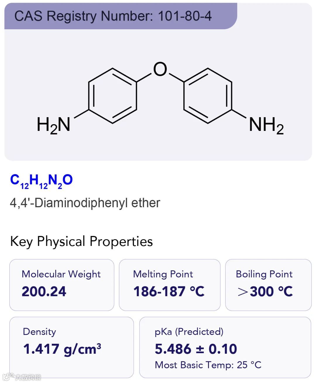4,4'-Diaminodiphenyl ether (4,4'-ODA), with the chemical formula of C12H12N2O and a molecular weight of 200.24, is an important organic compound. 4,4'-Diaminodiphenyl ether has a series of unique physical and chemical properties. It has a high melting point of about 186-187°C and a boiling point greater than 300°C. It is a fine chemical intermediate for the synthesis of medicines, dyes, insulating materials and flame retardant materials. The polyimide resin synthesized from this substance has the characteristics of high thermal stability, low flammability and excellent mechanical properties. As a high molecular weight monomer, 4,4'-Diaminodiphenyl ether has a wide range of applications in chemical industry, medicine, dyes, pigments, pesticides, electricity, electronics and other fields.