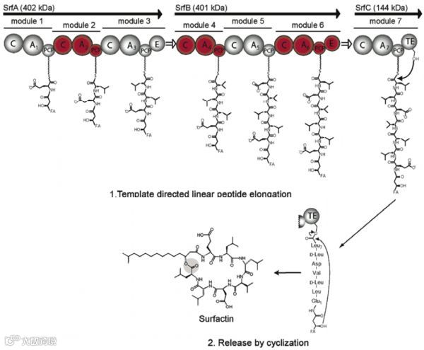 下图是Surfactin生物合成路线的概要图。氨基酸伸长→目标肽合成→切断脱离→环化。