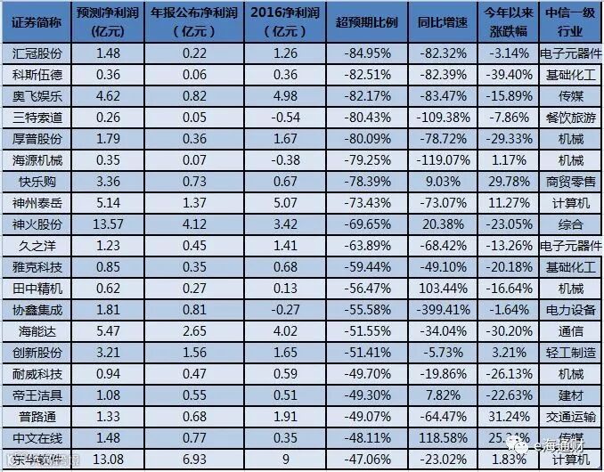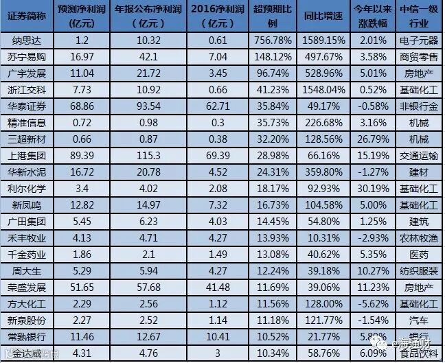 在个股层面,简单通过公司业绩增速进行筛选的做法并不可取。市场可能提前对公司的全年业绩有所预期和反应,投资者需要重点关注的应当是预期之外的部分。我们将以上1848家上市公司公布的业绩与近三个月各家券商发布的预测值进行比较,寻找业绩超预期的品种。