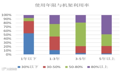 再看看机架上架率,回答30%以下的占10%,30-50%的24%,50-80%的占39%,80%以上的27%。说明我们的机柜利用率比较高了,目前低的可能是新建数据中心。集合数据中心投产使用年限,这个答案就更明确了。