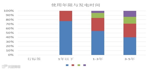 那发生较长故障中断的,与市电中断有无关联呢? 我们进一步分析发现,发电机启用超过50小时的,只有27.3%的故障中断时间超过1小时;发电机使用时间10-50小时的,81%发生了超过1小时的故障中断;发电机使用1-10小时的,56%发生了超过1小时的故障中断;发电机启用1小时内的,只有17%发生了1小时以上的故障中断。