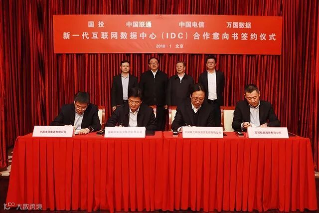 2018年1月3日,国家开发投资集团有限公司、中国联合网络通信集团有限公司、中国电信集团有限公司、万国数据服务有限公司在京签署合作意向书,决定共同开展新一代互联网数据中心(IDC)产业投资。国投董事长王会生,中国联通董事长王晓初、中国电信董事长杨杰、万国数据董事长黄伟等各集团主要领导出席了签约仪式,阳晓辉、梁宝俊、陈忠岳和蔡枫等四位副总裁代表各集团签订了合作意向书。