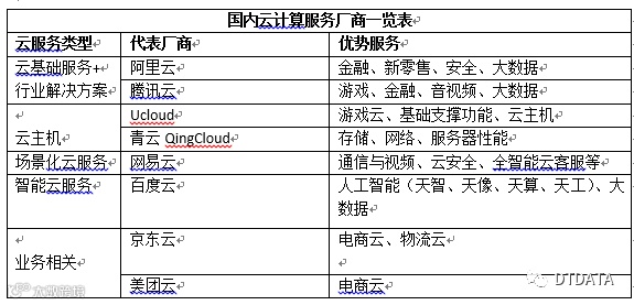 由上表可见,阿里云、腾讯云都以聚焦行业解决方案为主;青云与Ucloud以云主机的基础性能为主攻方向;京东和美团的云服务起步于自身主营业务;网易云和百度云算是有点想要独辟蹊径的意思,前者定位场景化云服务,后者押宝未来的人工智能领域。