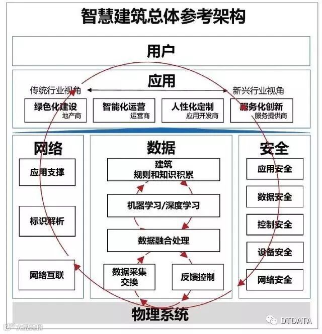 从总体概念上,阿里巴巴智慧建筑的参考架构如下所示,重点可从“网络”、“数据”和“安全”三个方面来理解。网络是基础,即通过物联网、互联网等技术实现建筑全系统的互联互通,促进感知数据的充分流动和无缝集成。